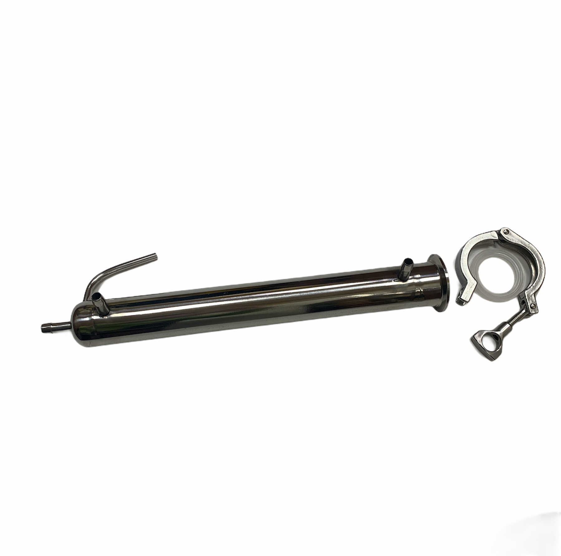 Холодильник в аппарате представляет из себя кожухотрубник, в котором установлено 6 трубок диаметром 8 мм, что дает отличное охлаждение и большую производительность до 4 литров в час ледяного самогона на выходе. А добавив дефлегматор можно получать чистейший спирт.